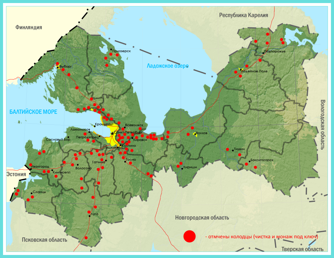 Красным кругом отмечены колодцы (чистка и монтаж под ключ)